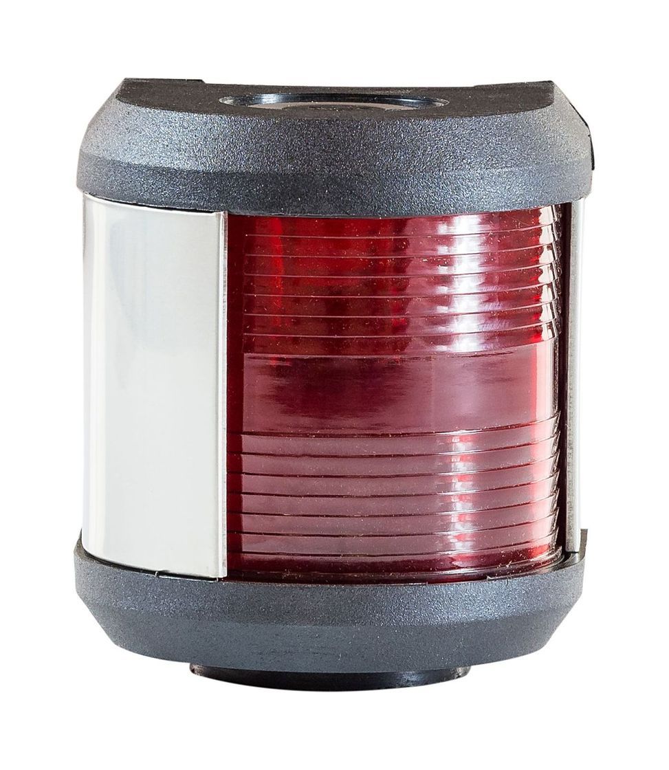 Левый отличительный — красный, сектор освещения 10 румбов, освещает дугу горизонта от направления прямо по носу до двух румбов влево позади траверза.