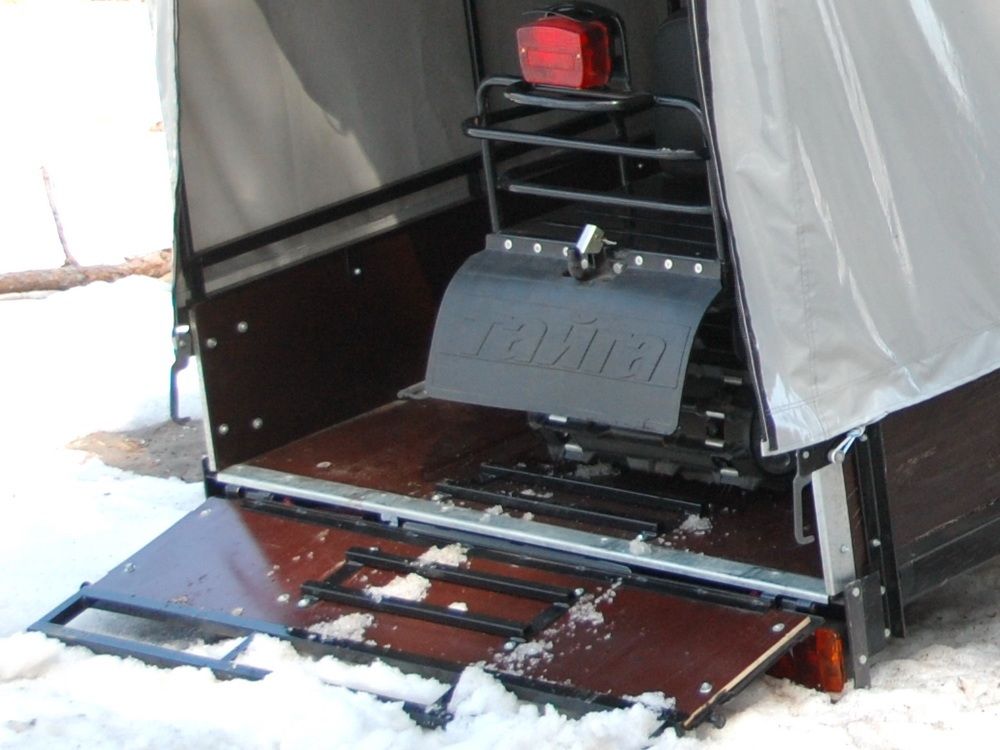 Трапики для погрузки снегоходов. Прицепы для перевозки снегоходов могут дополнительно оснащаться трапиками, которые устанавливаются на задний борт и заднюю часть днища прицепа и исключают пробуксовки гусеницы при погрузке снегохода своим ходом.